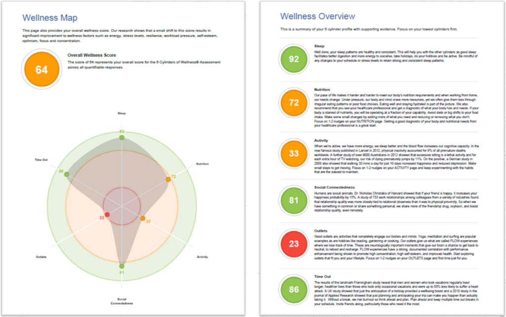 With this short questionnaire, you will get a balanced view of your own health and wellbeing against the key cylinders of sleep, nutrition, activity, social connectedness, outlets and time out.