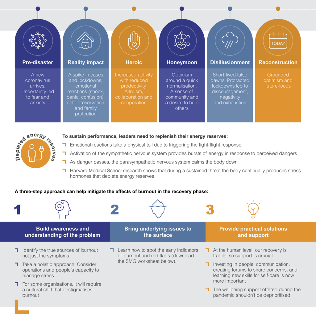 A year on from the pandemic, leaders and their teams should be experiencing a bounce-back in energy levels. Instead, many report a lingering sense of emotional exhaustion. To provide a framework to explain these seemingly irrational feelings, the ‘Emotional Response to Disaster’ model is instructive. It describes the shared emotional response to COVID-19 and provides a roadmap to help leaders normalise the emotional ups and downs still to come.