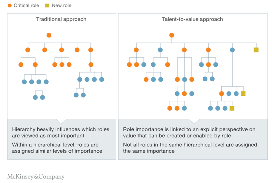 Interestingly, these roles are not centred at the apex of the org chart in the leadership team, value is peppered throughout the organisation. If fact, McKinsey estimates that 60% of value originates 2 levels away from the C suite and another 30% is 3 levels away or further. They also demonstrate that if you want to identify value, don’t ask executives as 70% of them identify value roles inaccurately.