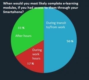 As part of our last newsletter, we asked readers their preference regarding access to professional development modules using smartphones. With 50% of respondents opting to do their digital professional development during their commute to & from work, this is definitely food for thought when developing digital learning strategies for your company.